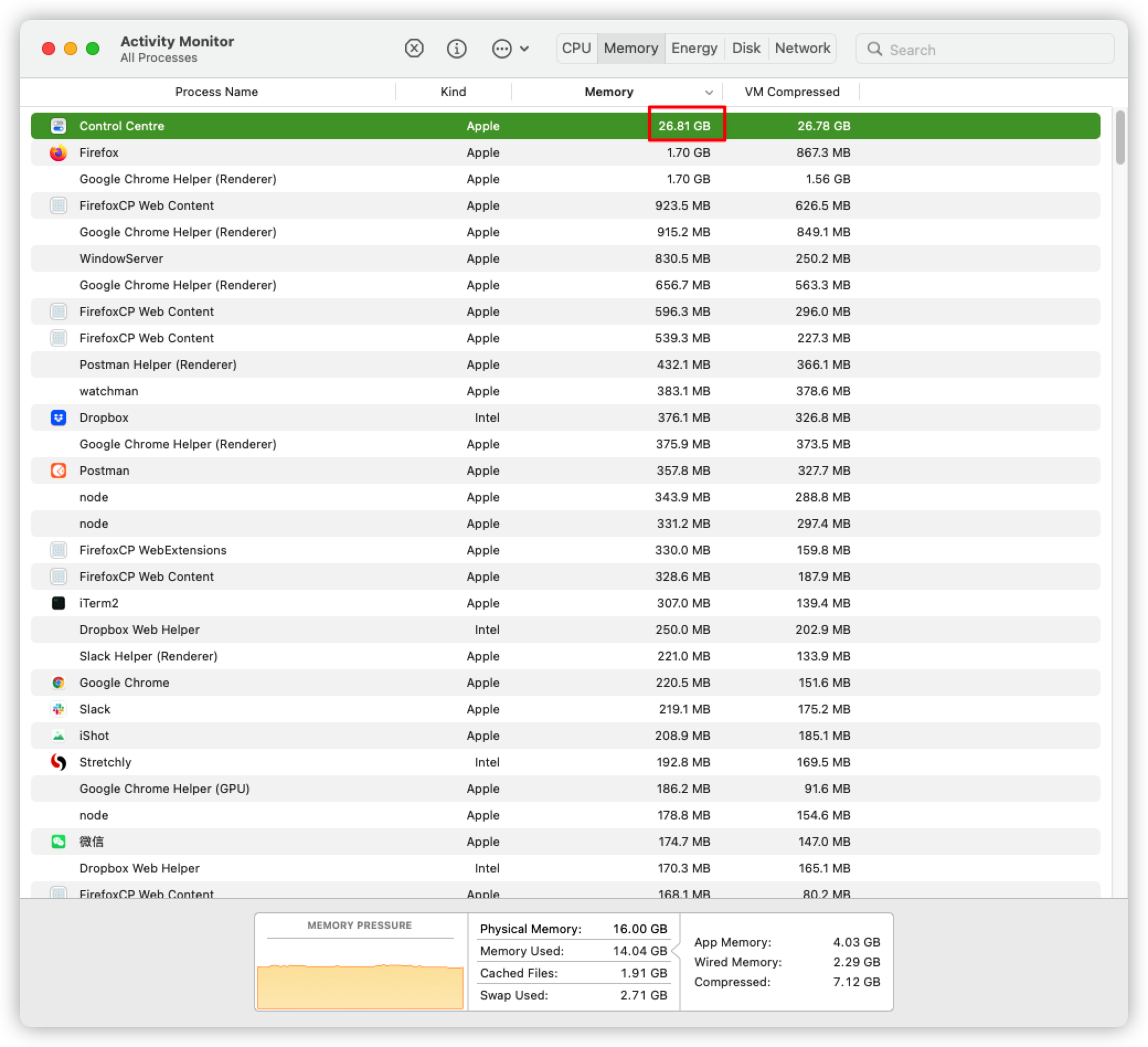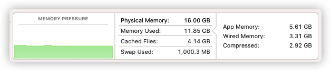 之前还在纠结买什么配置,我有几个同事是订了m1 max+64G内存,直接配置拉满,打算用上四五年,但我考虑之前我用的m1 macbook air都性能过剩了,就买了最低配的8核m1 pro,内存我也没升,就是标配的16G,我平时用的软件用不满16G,比如公司配的一台i7 macbook pro 16,开着很多tabs的firefox和safari,iterm2,vpn,slack,ms teams,ms vscode,outlook,postman,safari,内存也就用这么多: