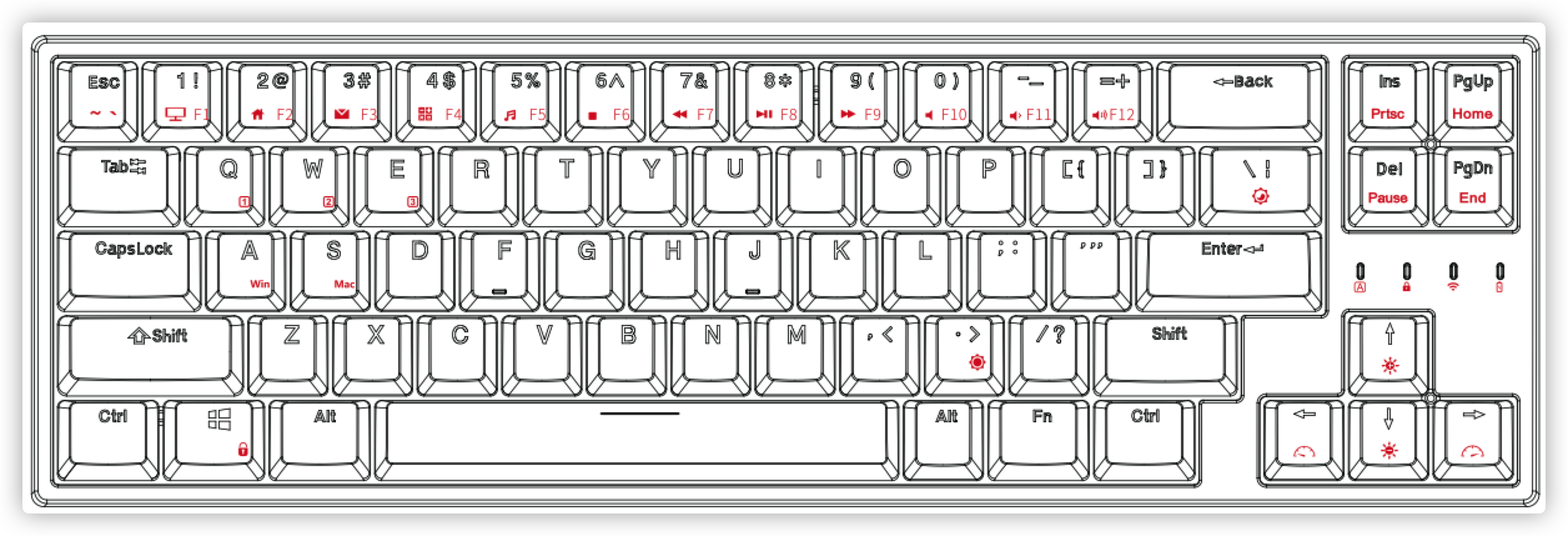 • 触发mac多功能键的方法很迷,先要按Fn+LCtrl,这样最上面一排的数字变成F1-F12,这时候用Fn+F1-F12就是对应的mac多功能键了。
